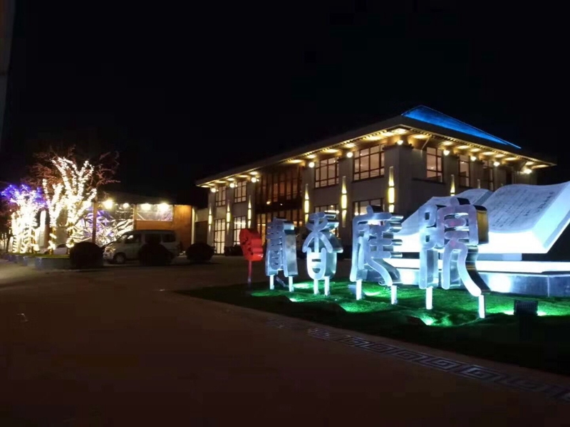 礼仪景观大道位于园区景观主轴线,穿过入户大堂,首先是“江山影壁”利用框景造园手法,将植株、山石利用景门框成一幅自然山水画,同时也起到了很好的分流作用;绕过“江山”至园内重点的景观区“一池山海”,金属网造型山脉与潺潺流水、灯光的完美融合,呈现出一幅立体画卷;向南沿伸为翰墨阁,用作户外等候区,也是一个景观驻足点;依次向南分别是利用LED灯和碎石子铺成水流涟漪状的“树影流径”和造型雕塑“丹青魅影”;最后是书香十六景中的第六景“荷塘涟漪”,位于景观中心地带,贯穿南北区,此处荷花塘设计为冬夏两用,即夏日蓄水为荷花塘,冬日抽干水作儿童游乐广场。中心纵向景观层次分明,水景丰富,应用LED、金属小品等现代元素并搭配绿植小品,使得四季皆有景可赏。