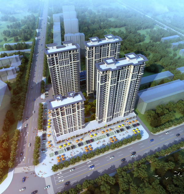该地块用地性质为居住用地、商业服务业设施用地,用地面积:42490.9平方米,总建筑面积:91297.45平方米,其中住宅建筑面积为69489.92平方米,商业建筑面积为6810.74平方米。南北两排住宅建筑与沿街商业围合形成中心景观区域,既满足用户需要又提升商业价值。另外还设计了物业配套建筑和文化活动中心,物业建筑面积为300平方米,不仅为用户提供了更加方便快捷的服务,还为用户配备了舒适的休闲娱乐活动区;小区道路等级分明,功能明确,沿街设置三个入口以及一个地下车库入口,小区道路宽6米,机动车位共665个,其中地上停车位293个,地下停车位372个,为业主提供了足够的停车空间;小区绿化率达到30%,让业主置身园林体会“曲径通幽处”、“小桥流水人家”的意境。