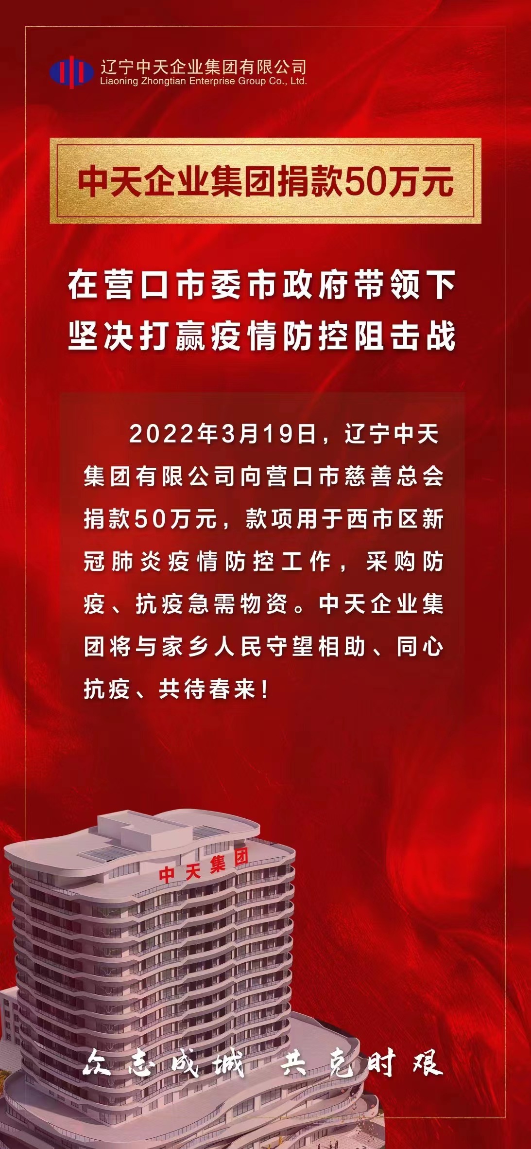 2022年3月19日,手机在线球赛买球app有限公司向营口市慈善总会捐款50万元,款项用于西市区新冠肺炎疫情防控工作,采购防疫、抗疫急需物资。中天企业集团将与家乡人民守望相助、同心抗疫、共待春来!