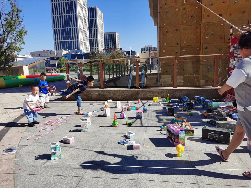 广场的另一侧也围着一群小朋友,这是部分小朋友正在套圈,只见小朋友全神贯注对着自己喜欢的玩具扔出一个个套圈,套回自己喜欢的玩具,一个个稚嫩的脸上都洋溢着快乐,我想这份快乐更多的来源于收获的喜悦。