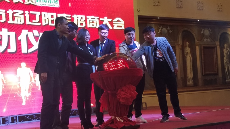 两点四十五分,中天农贸超级市场(辽阳御品店)招商会启动仪式正式开始,中天集团副总经理于洪波、辽阳分公司总经理孙继庄、中天农贸公司总经理张琳、中天农贸超级市场(辽阳御品店)副总经理郭子玮先生以及商户代表,共同触碰水晶球,完成启动仪式。五彩缤纷的水晶球,见证了着重要的历史时刻。